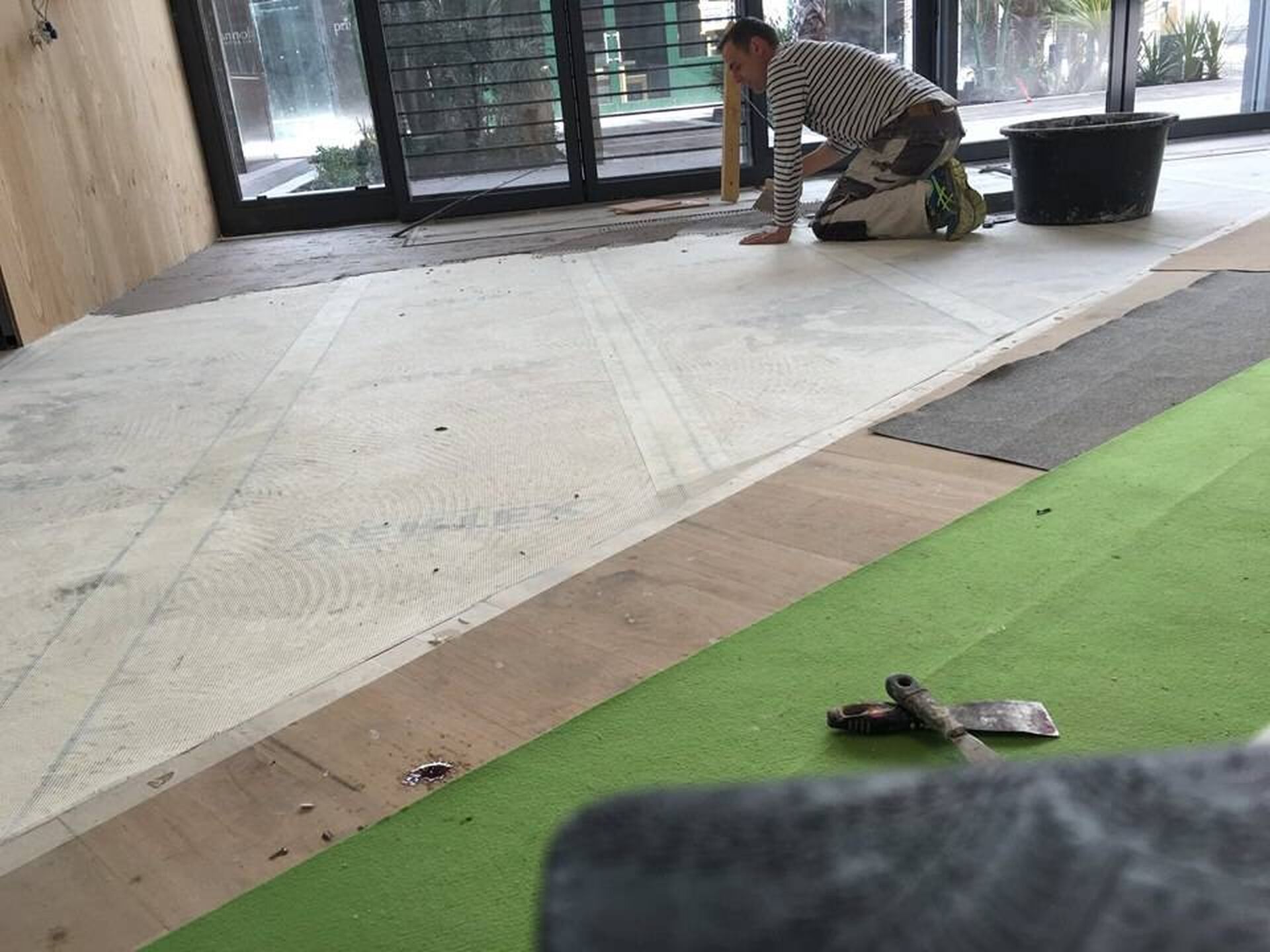 Les sols ont été ragréer avec le READECO FIBRE TERRE DU MONDE et la TRAME 4x4, puis application de 2 couches de BETON CIRE TERRE DU MONDE et application d'une couche de BOMATERIAUX TERRE DU MONDE : READECO - TRAME- BETON CIRE-BOUCHE PORE-HYDRO BETON BI COMPOSANT- TEINTE SUR MESURE EN PIGMENTS MINERAUXUCHE PORE TERRE DU MONDE et 2 couches de VERNIS BI COMPOSANT TERRE DU MONDE.