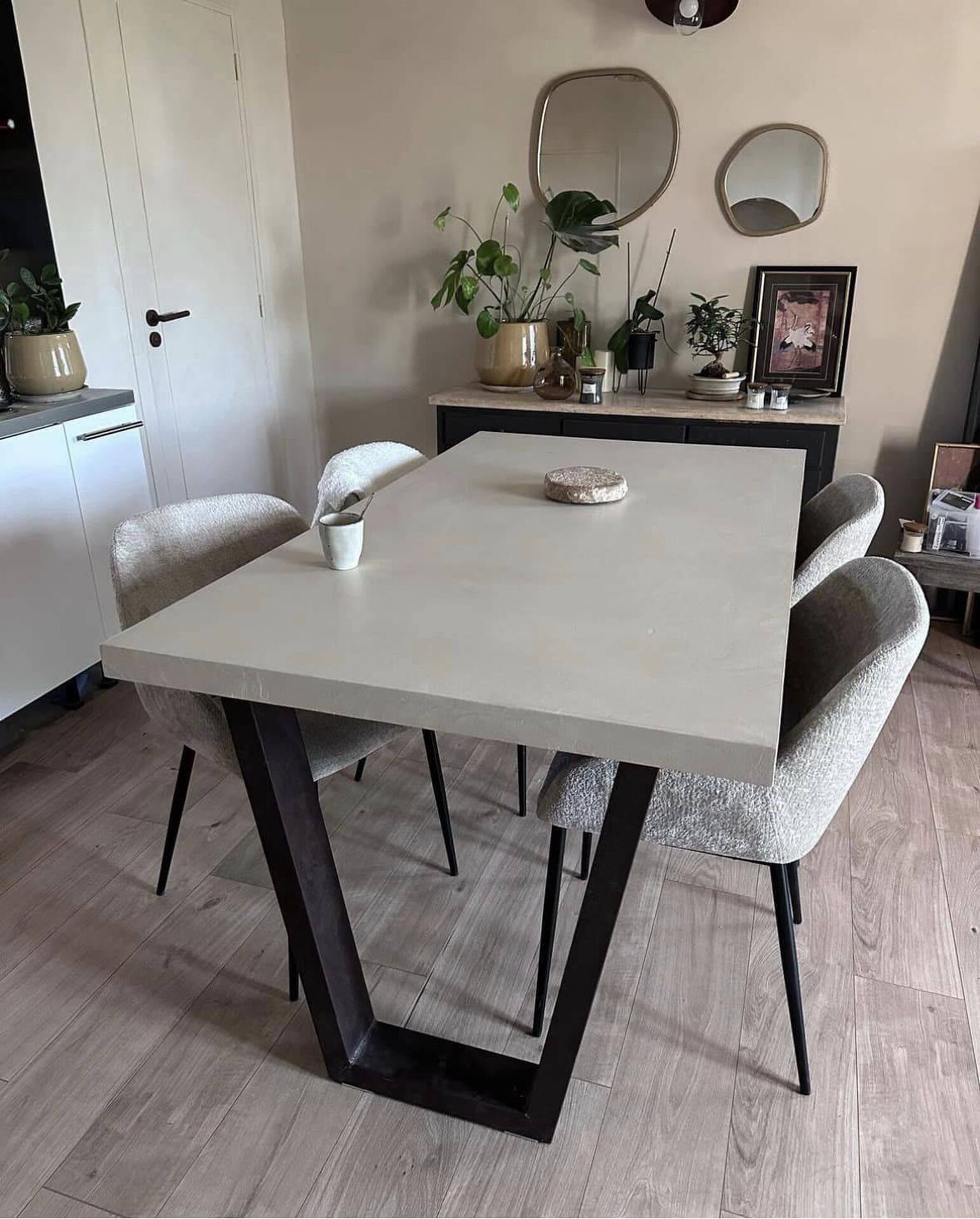 Les murs sont sublimés par un BADIGEON DE CHAUX de TERRE DU MONDE, créant une atmosphère authentique et chaleureuse. Le plateau en BETON CIRE de TERRE DU MONDE apporte une touche contemporaine, tandis que les pieds Metaldeco ajoutent une note industrielle sophistiquée.