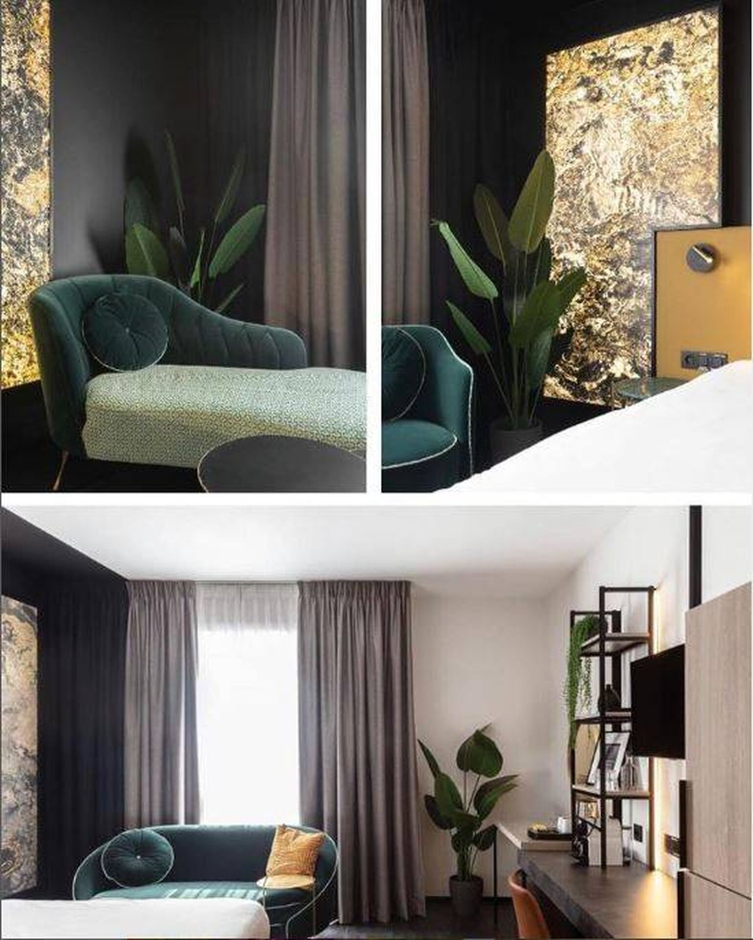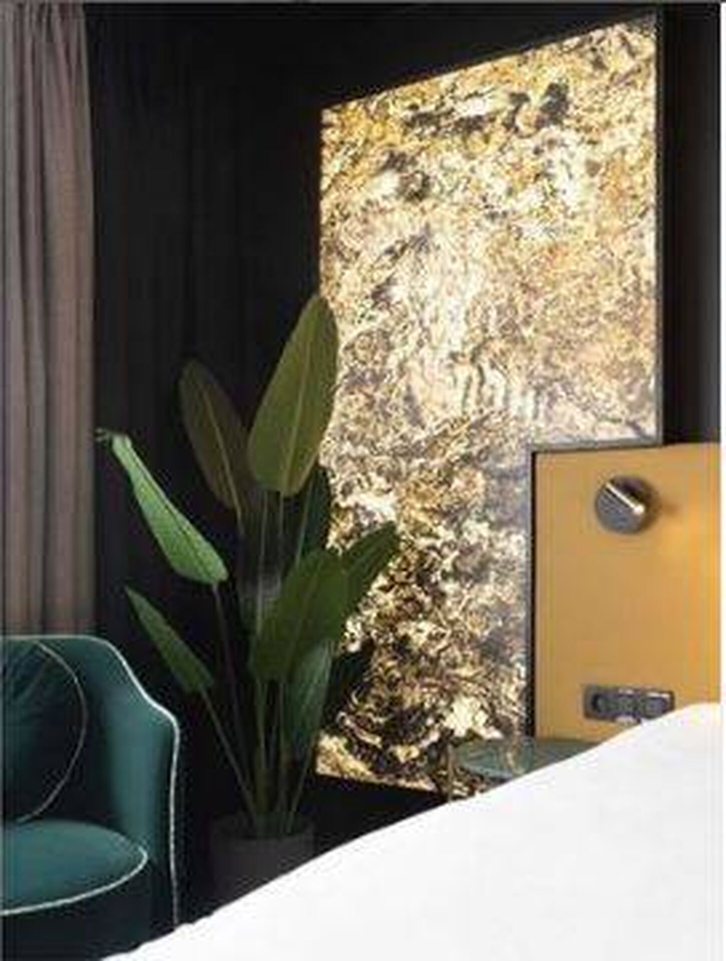 Que la pièce soit éclairée ou non, notre feuille de pierre Moscou a apporté un effet unique et minéral, ainsi qu'une ambiance naturelle à cette chambre de l'Ariane Hôtel à Ypres en Belgique.