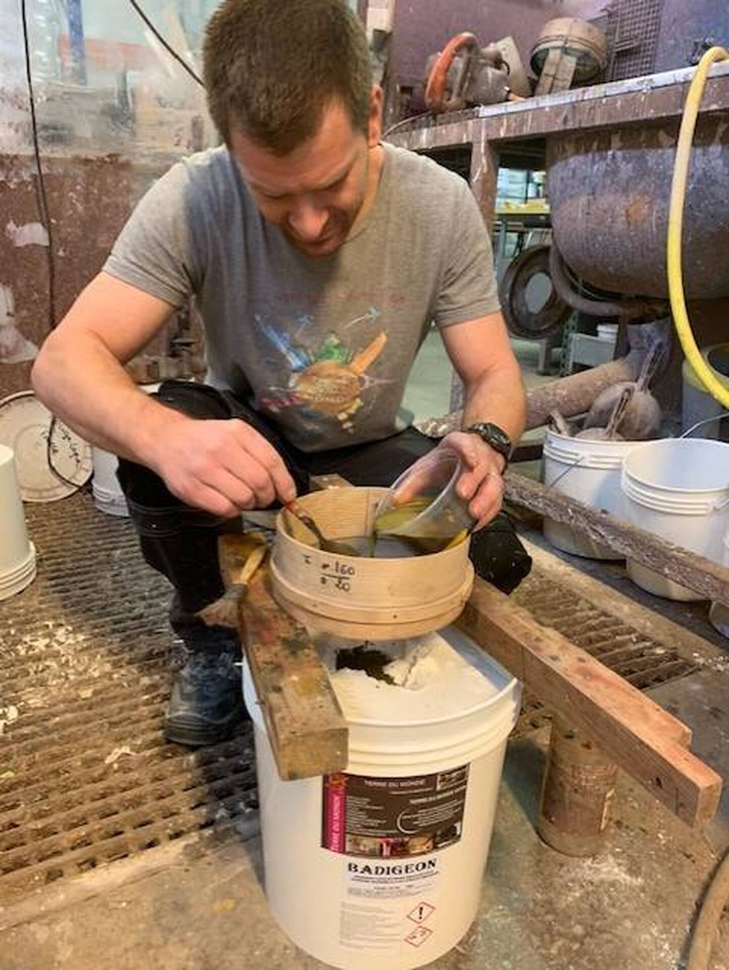 Après la fabrication du produit, il s'agit de le teinter avec des pigments minéraux....on nous demande souvent de contre typer une teinte ou de personnaliser une teinte....il faut à chaque fois fabriquer le matériaux, évaluer le ou les pigments que l'on va devoir mettre ainsi que la quantité, les détremper, les filtrer, puis malaxer et appliquer.....et ce autant de fois qu'il le faut pour arriver à la teinte demandée!